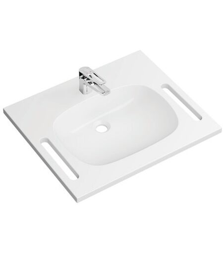 Hewi M40 ensemble de lavabo en fonte minérale 950.19.029 avec étagère et vasque ovale avec une surface non poreuse option de maintien intégrée utilisable comme porte-serviettes accessible selon DIN 18040 et ÖNORM B 1600/1601 élastique selon DIN EN 14688 pour la fixation des boulons de suspension ...
