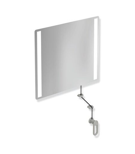 Hewi 801 miroir lumineux inclinable LED 801.01.40095 en verre feuilleté Miroir composite éclairé rectangulaire avec bords biseautés pare-éclats intégré et éclairage LED latéral intégré à droite et à gauche le Miroir peut être incliné de 28° maximum avec une manivelle et un câble de traction et peut donc être utilisé debout ou assis pour montage au mur pour montage mural avec renvoi de câble avec deux profils d'éclairage LED en aluminium attaché sur le dos LED de couleur blanche neutre environ 4000 Kelvin Puissance totale environ 9 6 watts LED et ballast protégés Classe de protection II Degré de protection IP 44 ...