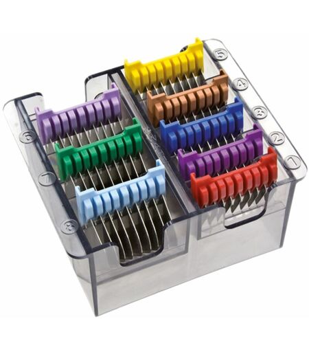 Ce lot de 8 surpeignes en acier est compatibles avec les têtes de coupe des tondeuses Creativa, Bravura et Super Groom Wahl, Arco 1854, Moser 1400 et Rex 1230. Ce coffret vous permettra d'avoir à votre disposition différentes longueurs. Lot de 8 surpeignes en acier inoxydable Wahl les têtes de coupe des tondeuses Creativa, Bravura et Super Groom Wahl, Arco 1854, Moser 1400 et Rex 1230 Cet assortiment vous permettra de toiletter toutes les races de chiens ou chats 8 longueurs : 3 mm, 6 mm, 10 mm, 13mm, 16 mm, 19 mm, 22 mm, 25 mm. Largeur de coupe 49 mm Facile d'utilisation, il se met en place facilement sur la tête de coupe en un clic sécurisé En acier inoxydable et avec des dents fines, ces surpeignes glisse facilement dans le poil de l'animal Code couleur sur les surpeignes pour les différencier Livré dans une boite en plastique avec compartiment pour faciliter le rangement 8 contre peignes renforcé en métal : #1 : 3 mm #2 : 6 mm #3 : 10 mm #4 : 13 mm #5 : 16 mm #6 : 19 mm #7 : 22 mm ...