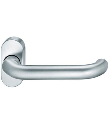 Poignée de porte profilée FS trou partie 06 1146 Poignée de porte en acier inoxydable, coudée, pour portes profilées coupe-feu et anti-fumée, sur rosace ovale, 70 x 32,5 mm, écrou carré de 9 mm, avec mécanisme de retenue, fixation non visible, homologuée pour les serrures d'issues de secours selon DIN EN 179. ...