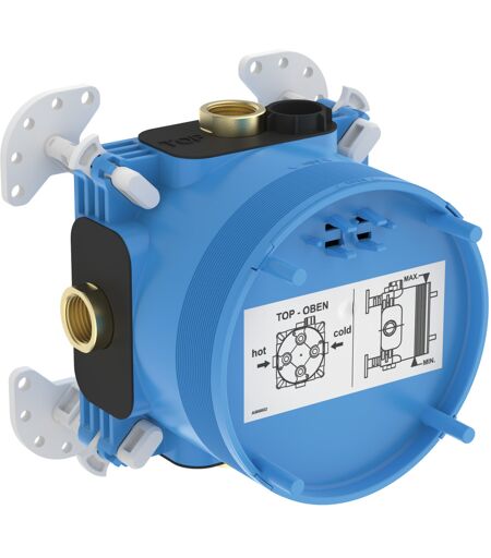 Kit d'encastrement standard Idéal 1 Easy Box A1000NU Numéro d'article : A1000NU pour robinetterie de bain, robinetterie de douche ou thermostats individuels pour installation murale et pré-montage de coque complet avec gabarit de nettoyage et bloc de rinçage avec FAST-FIX, un concept de fixation innovant avec une flexibilité maximale avec DICHT-FIX , un système d'étanchéité breveté pour une triple étanchéité sécurisée du corps de l'installation Résistant à la dézincification DZR raccords saillants G 1/2 Fixation directe ou avec des régleurs en hauteur Couleur NU Neutre Profondeur totale : 73-95 mm Ajusteur de hauteur : 5-40 mm Diamètre du cadre d'entretoise : 163 mm Comportement sonore DIN 4109, groupe 1 Installation uniquement en combinaison avec le kit d'encastrement 2 Accessoires recommandés : - Rallonge pour robinetterie bain/douche - Kit d'encastrement thermostatique simple 2 ...