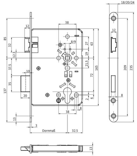 BKS Gretsch-unitas - Serrure à larder axe à 55 mm carré de 8 mm têtière de 18 mm bouts ronds condamnation droite