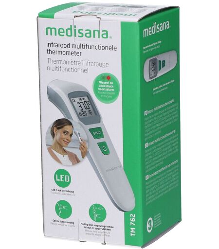 Contenu de la livraison1 MEDISANA Thermomètre infrarouge multifonctions TM 762 1 sac de rangement1 pile 3V (type CR2032) 1 mode d’emploiCaractéristiques du produitMesure précise et sans contact de la température corporelleFonction supplémentaire : mesure de la température ambiante, des objets et des liquides (0-100 °C)Alarme optique et acoustique de fièvre : Vert : température correcte, Rouge : hausse de la températureLumière de repérage LED pour déterminer le bon point de mesureSignal acoustique au début et à la fin de chaque prise (peut être désactivé pour les mesures pendant le sommeil).Mémorisation automatique des 30 dernières prises de températureAffichage de la date et de l'heureChoix de °C ou °FConception ergonomique et légèrePochette incluseDescription du produitLe thermomètre corporel infrarouge TM 762 mesure la température corporelle avec précision et sans contact. En quelques secondes, le thermomètre indique la température en combinaison avec une alarme de fièvre optique et acoustique. La couleur verte signifie que la température est correcte et la couleur rouge signifie que la température est élevée.IndicationsMesure précise sans contact de la température corporelleConseils d'utilisationLire la notice dans l'emballage.Précautions d'emploiLire attentivement le mode d'emploi avant la première utilisation. ...