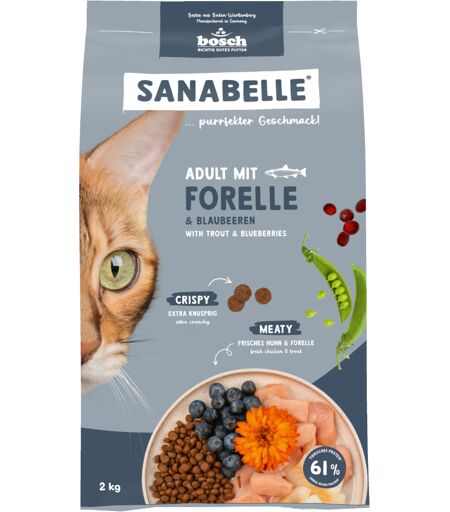 Sanabelle Adult, truite est une nourriture sèche particulièrement savoureuse pour les chats à partir de 12 mois. Sa recette associe beaucoup de volaille fraîche à de la truite délicate, fournissant ainsi des protéines animales de haute qualité et... ...