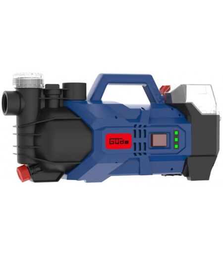 Puissante pompe de jardin a batterie du systeme de batterie 18V E3 pour une utilisation dans la maison et le jardin. Filtre a eau intégré Bouchon de vidange d'eau Fonction Eco pour une durée de fonctionnement plus longue avec une hauteur de refoulement plus faible Roue en Noryl Poignée de transport Indicateur de niveau de charge de la batterie Batterie remplaçable Domaines d'application: Pour l'irrigation du jardin. Caractéristiques techniques Tension d'alimentation: 18 V Classe de protection: III Volume déplacé: 2400 l/h max. hauteur de refoulement: 20 m Hauteur d'aspiration max.: 6 m Température max. de l'eau: 35 °C Filetage de raccordement: IG 1" Dimensions LxlxH: 425 x 150 x 220 mm Poids net: 3,4 kg Poids brut: 4,5 kg Batterie Tension de la batterie: 18 V Type de batterie: Li-Ion Capacité de batterie: 4,0 Ah Puissance de la batterie: 72 Wh Nombre de batteries: 1 Temps de charge de la batterie: 96 min Poids net: 0,64 kg Chargeur Tension d'entrée: 100-240 V Puissance absorbée: 80 W Fréquence chargeur: 50-60 Hz Tension de sortie: 18 V Courant de sortie: 3,0 A Tension batterie: 18V Capacité de batterie: 4Ah Nombre de batteries: 1 Systeme de batterie: Systeme de batterie Güde 18V E3 Technologie de la batterie: Lithium-Ion (Li-Ion) > ...