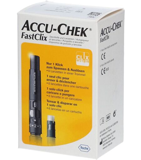 ACCU-CHEK FastClix AutoPiqueur + Cartouche de 6 LancettesTrès pratique, cet auto piqueur contient une cartouche de 6 lancettes. Lors de la manipulation, il est impossible de se piquer, cela maximise les risques de piqûres accidentelles.Le Fastclix permet en 1 seul clic d'armer et de déclencher la lancette.Conseils d'utilisationPositionner une cartouche de lancettes dans le stylo autopiqueur Accu-chek FASTCLIX Après avoir réglé la profondeur (de 1 pour le moins profond, peau plus fine à 5 pour le plus profond , peau épaisse), positionnez le stylo autopiqueur sur les cotés des doigts, de préférence sur l'annulaire et auriculaire, puis appuyer sur le petit bouton blanc. Une goutte de sang doit apparaître, suffisante pour la bandelette de glycémie préalablement installée dans le lecteur. Lorsque le chiffre 1 apparaît, vous êtes à la dernière lancette. Une fois utilisée, retirez le capuchon du stylo autopiqueur Accu-chek FASTCLIXet jeter la cartouche à la poubelle. Pas de risque de contamination ni de piqûre accidentelle. Remettez ensuite une nouvelle cartouche de lancettes Accu chek FASTCLIXConditionnement1 AutoPiqueur 6 Lancettes ...