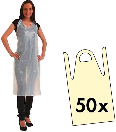 Tablier jetable à nouer. En film polyéthylène, blanc. Dimensions 120 x 80 cm. 50 par emballage. ...