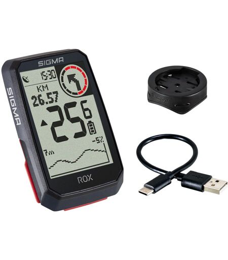 COMPTEUR CYCLE GPS AVEC MESURE DE L ALTITUDE Avec ses 30 fonctions et sa simplicit? d utilisation, le ROX 4.0 GPS vous sera d une grande aide lors de vos sorties ? v?lo et vous permettra de vous concentrer sur l essentiel : le plaisir. Le grand ?cran affiche les donn?es telles que le profil d altitude, la vitesse, la distance et la dur?e d entra?nement de mani?re fiable. Les indications d itin?raire et la connexion ? un v?lo ?lectrique ou ? des capteurs externes vont de soi pour le compteur cycle ROX 4.0 ! GRAND ?CRAN Gr?ce ? son contraste, ? sa diagonale de 2,4? et ? son grand affichage, l ?cran est parfaitement lisible m?me pendant l effort. RED CIRCLE L affichage novateur Red Circle en haut ? droite de l ?cran appara?t sur fond de couleur pour vos donn?es d entra?nement. TOUT SOUS CONTR?LE L application SIGMA RIDE vous permet de choisir vous-m?me les donn?es affich?es ? l ?cran. Vous pouvez ici choisir jusqu ? six aper?us avec trois valeurs ? chaque fois. La vitesse actuelle et l heure reste affich?es en permanence ? l ?cran. PR?T ? ALLER ROULER ? TOUT MOMENT ! Le compteur cycle ROX 4.0 s installe directement sur le guidon en un tour de main sans aucun c?ble ou capteur. Si vous le souhaitez, vous pouvez ?galement connecter votre ROX 4.0 ? d autres capteurs pour la mesure de la vitesse, de la fr?quence cardiaque et de la cadence. Gr?ce au GPS et ? GLONASS, votre ROX d?termine votre position en quelques secondes apr?s son allumage. Vous pouvez ensuite imm?diatement d?buter votre tour gr?ce ? sa commande intuitive ? trois touches. L application SIGMA RIDE permet de r?gler les donn?es affich?es ? l ?cran. PARFAITEMENT POSITIONN? Le support potence Butler permet un alignement id?al de votre compteur cycle ROX 4.0, m?me sur les potences courtes. Votre compteur cycle peut ainsi ?tre centr? en ?tant plac? sur la potence, ? la hauteur du guidon. Votre guidon reste ainsi d?gag? et ordonn? et vous conservez une visibilit? parfaite sur toutes les valeurs, m?me sur des v?los autres que des V.T.T. Le support s adapte aux guidons de 31,8 ? 35 mm de diam?tre. ? LA HAUTEUR Le capteur de pression atmosph?rique int?gr? est un des gros atouts du ROX 4.0. Cette mesure barom?trique fournit des informations fiables sur l altitude, permet de d?terminer les mont?es et les descentes et donc d afficher un trac? pr?cis de votre itin?raire. Un profil d altitude graphique peut ?tre consult? sur le ROX 4.0. L altitude de d?part au d?but du tour peut ?tre automatiquement d?termin?e au moyen du GPS ou r?gl?e manuellement. UN PR?CURSEUR Connectez votre ROX 4.0 ? l application Komoot et rangez votre Smartphone dans votre poche. Votre application Komoot envoie alors vos indications d itin?raire sur votre ROX 4.0. Celles-ci peuvent, au choix, ?tre affich?es sous la forme de fl?ches ? l ?cran ou dans votre Red Circle. Le cercle rouge qui appara?t ? l ?cran indique la distance jusqu au prochain changement de direction au moyen de segments de couleur. Ces barres se r?tr?cissent au... ...
