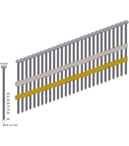 Streifennägel Type RK28/65BK Glattschaft Nagellänge 65 mm Drahtmaß Ø 2,8 mm Ausführung Kunststoffmagazinierung Stück/Schachtel 3.000 Gewicht pro Schachtel 10,95 kg Verpackungseinheit 1 x 3.000 -- Prebena RK-Streifennägel (Rundkopfnägel) von 50 - 160 mm - Drahtmaß : 2,9 - 4,6 mm - Kunststoffmagazinierung - Neigung 20° sind u.a. kompatibel mit folgenden Geräten bzw Systemen: BeA - R 20 Bostitch - KN Bostitch - PL 21° Dewalt - Streifennägel ST 20° Duofast - Streifennägel SN Haubold - RB 29/50 - RB 50/160 Hitachi - Streifennägel ST 20° Holzher - Nagelstreifen Mafell - Nägel 2,7x55 bis 3,4x100 Max - Streifennägel ST 20° Paslode - Hartplast-magazinierte Nägel Powerfix - ST 20 Schneider - RN 29/65 - RN 34/100 Senco - Streifennägel MC/OC Würth - Streifennägel 20° PREBENA Glattschaftnägel entsprechen der DIN 1052 Teil 2 (Zugfähigkeit des Nageldrahtes, Kopfdurchmesser usw.). Die Nägel sind längenabhängig geharzt. Glattschaftnägel nach DIN 1052 Teil 2 benötigen keine weiteren Zulassungen. ...