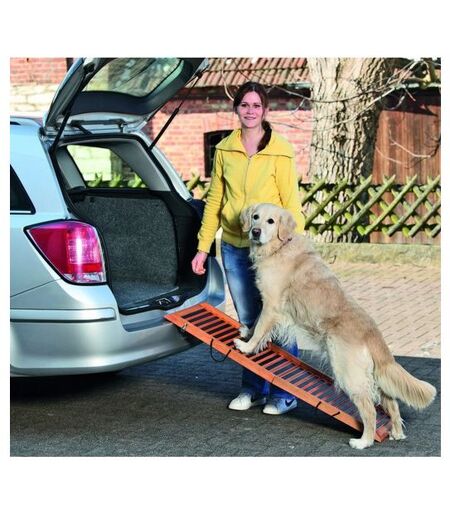 Rampe d’accès pliante pour chien - modèle économique. Rampe d’accès pliable pour chien 120 cm de long x 30 cm de large. Idéal pour les chiots, les chiens agés, lourds ou en convalescence. Soulage les hanches et les articulation, permet de monter et de descendre du véhicule avec facilité. Fabrication en bois avec des lamelles anti dérapantes. Se plie très facilement (61 cm de long pliée), ne prend pas de place dans le coffre. Ne nécessite aucune installation, se pose simplement sur le pare chocs grâce aux protections caoutchouc. Poids de la rampe : 3.70 kg Epaisseur pliée 13 cm ...