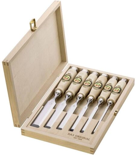Description générale Jeu de ciseaux à bois Kirschen, composé de 6 pièces avec des largeurs de lame de 6, 10, 12, 16, 20 et 26 mm. Ces ciseaux sont fabriqués en acier à outils spécial à haute teneur en carbone et présentent un manche en hêtre blanc de forme Ulm, aplati et laqué. Ils sont livrés dans un coffret en bois élégant, idéal pour le rangement et la protection des outils. Spécifications techniques Matériau : Acier à outils spécial Biseaux latéraux : Oui Largeurs de lame : 6, 10, 12, 16, 20, 26 mm Norme : Conforme à DIN 5139 Emballage : Coffret en bois Compatibilité et accessoires Ce jeu de ciseaux est compatible avec une variété de projets de menuiserie et de bricolage. Il peut être utilisé avec des accessoires de travail du bois standards. Installation Aucune installation spécifique n'est requise. Les ciseaux peuvent être utilisés directement après avoir été sortis du coffret. Utilisation Ces ciseaux à bois sont conçus pour une utilisation professionnelle et amateur. Ils sont ...