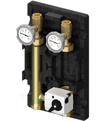 Groupe de pompe Meibes Edition 8 MK pour circuits de chauffage mixtes DN 25 · PN 6 Composants en acier · Laiton · PTFE · joint en fibre sans amiante et EPDM composé de : 1 vanne à boule à 2 voies avec thermomètre à aiguille intégré rouge 1 vanne à boule à 2 voies avec thermomètre à aiguille intégré bleu et frein de gravité avec dispositif d'ouverture 1 mélangeur T à 3 voies 1 stabilisateur entre l'aller et le retour 1 tuyau de retour · composants ci-dessus montés et étanchés en usine 1 isolation prête à poser en EPP avec support mural sans pompe · pour 1 pompe (EL 180 mm) côté d'aller à droite Connexions : filetage intérieur G 1(unknown) en haut · filetage extérieur 1 1/2(unknown) à bride plate en bas Valeur kvs : 6,2 Indicateur de température : 0 à 120 degrés Température d'utilisation : jusqu'à 110 degrés Distance entre axes : 125 mm Hauteur : 420 mm Largeur : 250 mm Profondeur : 255 mm Modèle : avec moteur d'entraînement monté ...