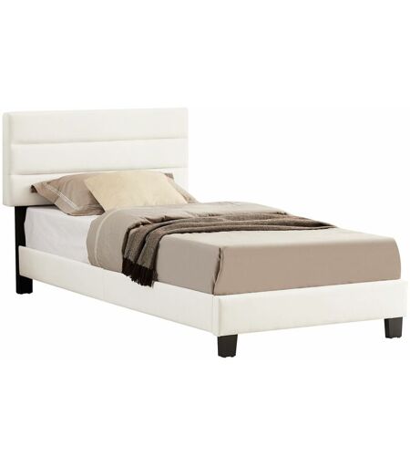 Le lit simple Florida ... avec sa tê te de lit capitonné e moelleuse, invite à passer une bonne nuit de sommeil. Son revê tement moderne en tissu blanc s' accordera facilement avec le reste des meubles de votre chambre. Ce lit 1 place pour enfant comme adulte, est particuliè rement confortable. Vous pouvez ré gler la hauteur de la tê te de lit au montage selon 3 positions, ainsi vous pouvez ajuster ce lit selon votre taille ou la taille de votre matelas. Le sommier est inclus. Description des maté riaux : La structure du lit est recouverte d' un revê tement en tissu capitonné , de coloris blanc. Les pieds du lit sont en plastique de coloris noir. Les lattes du sommier sont en contreplaqué . Caracté ristiques du produit : Lit simple 90 x 190 cm Hauteur pieds de lit: 25 cm Hauteur (position basse) : 94 cm Hauteur (position moyenne) : 100 cm Hauteur (position haute) : 104 cm Sommier à lattes inclus Matelas non inclus Livraison et montage : Contenu de la livraison : lit, sommier, notice ...