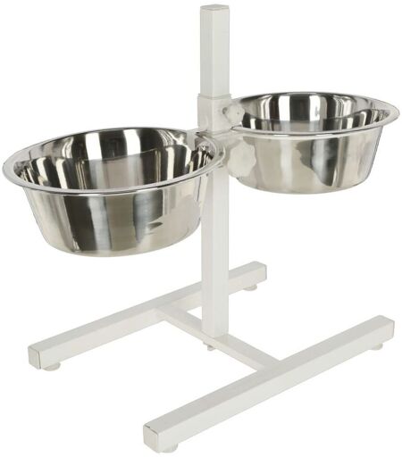 Ce bol alimentaire pour chien avec support de la marque Kerbl est le choix idéal pour votre ami à quatre pattes. Ce produit vous offre, ainsi qu'à votre chien, de nombreux avantages. 2 bols d'alimentation : cet ensemble d'alimentation pour chien est livré avec un support et 2 bols, vous permettant de donner à votre chien à la fois de la nourriture et de l'eau.Hauteur ajustable : les conteneurs en acier inoxydable peuvent être ajustés en hauteur afin que vous puissiez facilement adapter leur hauteur à la taille du chien. Donc votre chien ne doit pas se pencher trop pour manger de la nourriture ou boire de l'eau.Antidérapant : le fond est équipé de capuchons en caoutchouc pour éviter de glisser. Ainsi, le bol à nourriture tient fermement sur le sol, ce qui le rend plus difficile à déplacer ou à pousser.CONSEIL : en général, les chiens sont très désordonnés lorsqu'ils mangent et boivent ! Placez un tapis d'alimentation sous le support pour attraper la nourriture et l'eau que votre chien laisse tomber. Ainsi, votre sol reste plus propre et il est facile de nettoyer les dégâts. Couleur : blanc Matériau : acier inoxydable Hauteur : 43 cm Hauteur réglable des bols Avec mécanisme de fixation du bol Pieds en plastique réglables en hauteur La livraison contient : 2 x bol en acier inoxydable Système de fixation du bol Support ...