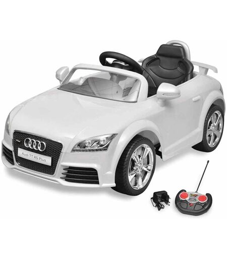 Cette voiture pour enfants Audi TT RS combine un style sportif avec des fonctionnalités extraordinaires pour enfants, et sa couleur blanche étincelante en fait un véritable véhicule attrayant. Avec deux vitesses avant et arrière contrôlées par une pédale, elle est à la fois souple et sûre. Le lecteur de musique intégré au volant ajoute encore au plaisir de conduire. Les parents peuvent changer de direction et de vitesse librement avec une télécommande. Le trajet de cette voiture est faible, donc il est facile pour les enfants de monter et descendre seuls. C¿est aussi solide que cela en a l¿air et autant de plaisir à conduire. L'assemblage est très facile. Couleur : blanc Dimensions : 110,2 x 59 x 47,5 cm (L x l x H) Matériau : plastique Produit original officiellement immatriculé Capacité maximale : 30 kg Moteur : c.c. 6V / 12000 R Batterie : 6V / 4,5 Ah Chargeur : c.c. 8V / 600 mA Vitesse : 2,5 km / h Avec fonction de contrôle parental à l'aide de la télécommande Appareil de musique intégré au volant Marche avant et arrière contrôlée avec une pédale Assemblage facile Pile rechargeable et chargeur inclus Fonctionnement sur 3 piles AA de 1,5 V pour la télécommande (non incluses). ATTENTION : à utiliser sous la surveillance directe d'un adulte ATTENTION : N'utilisez pas ce jouet dans d'autres zones que le sol privé, car les dangers possibles peuvent en résulter autrement ATTENTION : L'article ne convient pas aux enfants de moins de 36 mois. Avertissement. Un équipement de protection doit être porté. Ne doit pas être utilisé dans la circulation. Ce jouet ne convient pas aux enfants de moins de 3 ans en raison de sa vitesse maximale. ...
