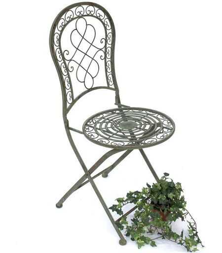Chaise de jardin décorative en métal de style antique, parfaite pour le jardin, le balcon, la terrasse ou même dans votre salon. Cette chaise en fer est peinte avec des peintures de haute qualité de couleur vert antique et son design patiné apporte une touche de nostalgie à votre maison. Somptueusement décorée en fer massif et finition aspect rouille. Convient pour l'extérieur et l'intérieur. Hauteur 92 cm, diamètre 38 cm, hauteur d'assise 47 cm . ...