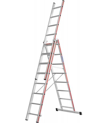 Échelle polyvalente de 3 parties • Aluminium • Germes à partir du profil laminé • Pieds d'échelle pressés avec Holm • Ferrures massives en acier • Sécurisation de l'écart par des ceintures perlonées à haute résistance • Traverse • Largeur des conducteurs 300 mm Note : Échelles à raillage et à coulisse combinables avec de nombreuses possibilités d'utilisation 1992. Construction en position d'escalier seulement jusqu'à Taille 3 x 10 possible. ...