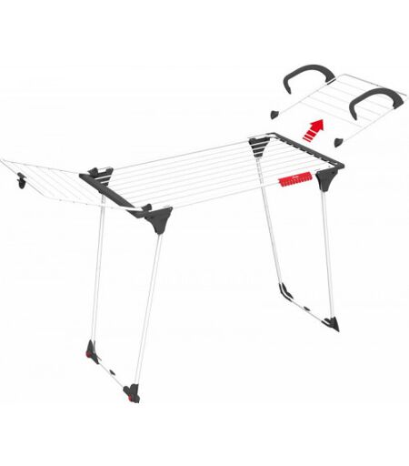 Séchoir modulable sur pied avec aile détachable pour radiateur • Premium 2en1 est équipé d’une aile détachable qui peut être utilisée comme un séchoir d’appoint sur un radiateur, une porte, une vitre ou un balcon • Les bras de l’aile sont extra-résistants, indéformables et ajustables • Il se déplace aisément grâce à ses roues, cela veut dire que il est facile à transporter, il est aussi facile à remettre à plat • Ses fils centraux épais XXL ne laissent pas de plis sur le linge et réduisent le temps de repassage • Son format « table » laisse de l’espace libre sous le séchoir pour les vêtements longs et le linge de maison • Un système de blocage des ailes permet de le plier et de le ranger sans problème • Grâce à son accessoire porte-chaussettes, pas besoin de pinces à linge pour les petites pièces de la lessive (chaussettes et sous-vêtements) • Bras de l'aile modulable en résine disposant de la technologie nytrogen : anti -torsion, et anti- pliage > ...