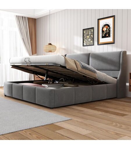 Dans Les Nuages - Lit coffre capitonné 140x190 cm, tissu velours, avec forme oreille tête de lit, sommier à lattes, pour adultes et adolescents - gris