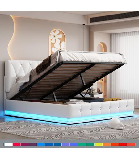 Description générale Ce lit moderne et fonctionnel est équipé de magnifiques lumières LED contrôlées par une télécommande, offrant 4 modes automatiques et 16 couleurs de lumière. Sa structure robuste en métal peut supporter jusqu'à 300 kg, tandis que son mécanisme de levage hydraulique à double action permet un accès facile à l'espace de rangement de 35 cm situé sous les lattes, idéal pour les espaces réduits. Spécifications techniques Dimensions du produit: 203 x 142 x 104-114 cm Longueur: 203 cm Largeur: 142 cm Hauteur: 114 cm Matelas recommandé: 140 x 200 cm (hors matelas) Poids: 45 kg Capacité de charge: 300 kg Couleur: Blanc Matériaux: Similicuir, Bois, MDF, Acier Style: Moderne Montage requis: Auto-assemblage, guide de montage illustré inclus Compatibilité et accessoires Le lit est compatible avec un matelas de dimensions 140 x 200 cm. Certains accessoires sont intégrés dans l'espace caché derrière la tête de lit. Installation Le montage est requis, et un guide de montage ...