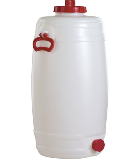 Fût rond, capacité 50 l, 1 pièce et +. Produit livré = monté. Hauteur = 690 mm. Poids = 2.3 kg. Coloris = blanc. Matériau = polyéthylène (LDPE). Diamètre = 350 mm. Diamètre ouverture = 120 mm. Nombre de poignées = 2 pces. Températures d'utilisation = -20 °C à +50 °C. Equipement = poignées. Couvercle = oui. Coloris du couvercle = rouge. Charge par poignée = 30 kg. Version = avec robinet en plastique DN 10 mm. Type de produit = fûts. À partir de 30 litres avec 2 poignées tombantes latérales. En standard, avec robinet en plastique. Modèles résistants à de nombreux acides et bases (nous consulter). Températures d'utilisation de -20 °C à +50 °C. En polypropylène basse densité qualité alimentaire. Avec deux poignées abattantes latérales (force par poignée max. 30 kg). Robinet en laiton disponible contre supplément de prix (voir page ci-contre). ...