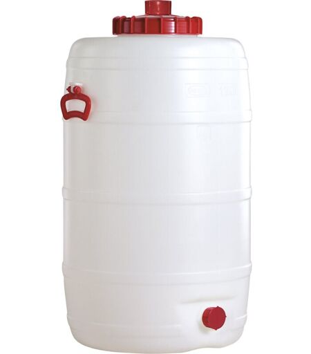 Fût rond, capacité 125 l, 1 pièce et +. Produit livré = monté. Hauteur = 850 mm. Poids = 5.2 kg. Coloris = blanc. Matériau = polyéthylène (LDPE). Diamètre = 490 mm. Diamètre ouverture = 200 mm. Nombre de poignées = 2 pces. Températures d'utilisation = -20 °C à +50 °C. Equipement = poignées. Couvercle = oui. Coloris du couvercle = rouge. Charge par poignée = 30 kg. Version = avec robinet en plastique DN 15 mm. Type de produit = fûts. À partir de 30 litres avec 2 poignées tombantes latérales. En standard, avec robinet en plastique. Modèles résistants à de nombreux acides et bases (nous consulter). Températures d'utilisation de -20 °C à +50 °C. En polypropylène basse densité qualité alimentaire. Avec deux poignées abattantes latérales (force par poignée max. 30 kg). Robinet en laiton disponible contre supplément de prix (voir page ci-contre). ...