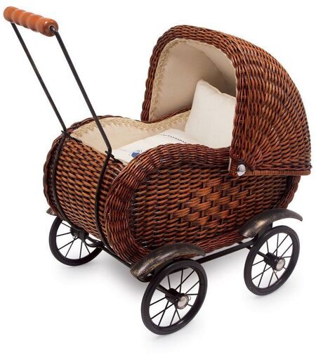 Landau de poupée en osier rétro > 51 x 32 x 52 cm Ravissant landau en osier pour mamans de poupées exigeantes ou en guise de décoration. Une douce couverture et des coussins au motif charmant, la structure en métal d'apparence oxydée ainsi que les garde-boue ajoutent une touche rétro! Les roues couvertes d'anneaux de caoutchouc assurent des déplacements silencieux dans la maison.Dimensions: env. 51 x 32 x 52 cm Hauteur poignée: 53 cmMatériel: bois, osier et tissuPoids: 4,58 kgAvec garde-boue.Fabrication européenne ...