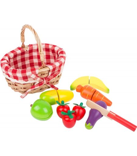 Un joli panier de pique-nique tressé, rempli de fraises, carotte, aubergine, épis de maïs, pomme et banane. Avec le couteau en bois fourni, les aliments peuvent être coupés au niveau des joints Velcro. Ainsi, outre le plaisir de jouer, la motricité n?est pas négligé non plus! Le contenu de cet ensemble de pique-nique de 15 pièces peut être rangé facilement dans le panier et transporté au prochain lieu de pique-nique. Un complément idéal de la boutique marchande. Dimensions Panier env. 16 x 12 x 10 cm, couteau env. 12 x 2 cm Marque small foot Matériel bois Age minimum recommandé à partir de 3 ans Contenu 1 panier, 1 couteau, 2 moitié de pommes, 2 moitié de banane, 2 moitié d`'épis de mais, 2 moité d'aubergine, 3 fraises Emballage emballage small foot Poids, emballage inclus 0,44 kg Content 10 pièces ...