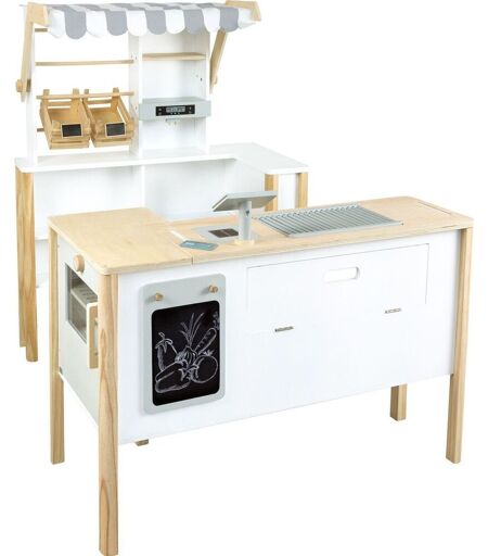 Boutique marchande Multifonctionnelle complète "FRESH" Boutique marchande, kiosque et snack-bar, stand de marché, cuisine ou café? Aucun enfant n´a besoin de se décider ici! Ce grand stand de vente moderne avec housse amovible est un multi-talent qui peut changer sa fonction en un clin d´?il. Les modules flexibles créent d´innombrables possibilités de jeu et peuvent être placés en fonction de l´espace disponible et de l´idée de jeu. L´équipement ne laisse rien à désirer: scanneur avec affichage et tapis roulant, 2 paniers de vente avec étiquettes de prix, tableau à offres, robinet, machine à café, évier/caisse, barbecue/plaque chauffante et four/frigo ! Offre beaucoup d'espace pour plusieurs enfants ! En imitant des situations quotidiennes, l'accent est mis sur l'apprentissage ludique et amusant, dans lequel l'interaction sociale s'apprend dans les rôles d'acheteur et de vendeur ou en cuisinant. Après le jeu, on regroupe les éléments pour gagner de la place. Un vrai classique du jeu de rôle dans un design nordique moderne et simple !Dimensions : 106 x 40 x 106 cm - hauteur de travail : 60 cmHauteur: 60 cmMatériel : tissu, plastique et boisPoids : 28,2 kgCaractéristiques particulières : Articles aimantés Fabrication européenne ...