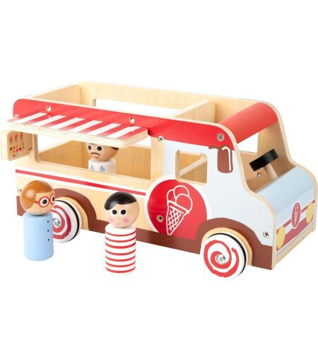 Camion vendeur de glaces en bois - Il fait chaud, et si on mangeait une glace ? - Ce camion à glace extra-large en bois robuste avec pneus caoutchoutés est particulièrement pratique pourrouler un peu partout - Il peut être joué par le haut, dispose d une fenêtre de vente à charnières et d une porte de conducteur qui s ouvre - Une affiche de glace dépliante avec des impressions détaillées des variétés de crème glacée et trois figurines en bois complètent ce beau camion - Dimensions : Camion env. 30 x 16 x 15 cm, figurine env. 8 cm, Ø 3 cm - Age recommandé : à partir de 18 mois - (cet article est généralement expédié sous 5 à 15 jours) ...