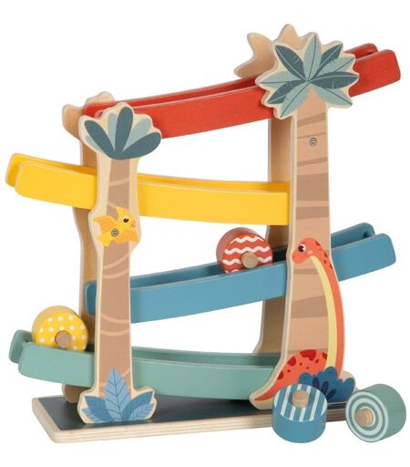 Voyage rapide à travers le monde préhistorique des dinosaures ! Ce circuit de boules en bois certifié FSC apporte des aventures fulgurantes dans la chambre des enfants lorsque les quatre roues en bois de couleurs différentes dévalent les quatre rampes. Les éléments qui roulent et descendent la piste sont source de fascination et de grand divertissement pour l'enfant. ...