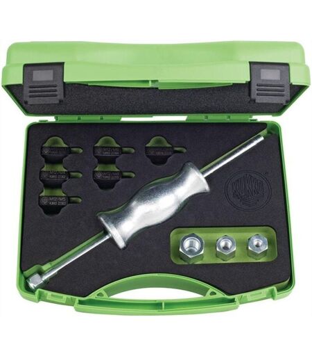 Description générale Le jeu de masse à inertie KUKKO KS-22-01 est un outil essentiel pour l'extraction sans contact et délicate de pièces à filetage intérieur. Il permet d'extraire efficacement des roulements à billes, des bagues extérieures de roulements et des manchons adhérents. Ce kit complet est présenté dans un coffret en plastique pratique, facilitant son rangement et son transport. Spécifications techniques Modèle : KS-22-01 Poids : 3 kg Contenu : 10 pièces incluant un marteau d'inertie et neuf adaptateurs Adaptateurs pour filetages : M3, M4, M5, M6, M7, M8, M10, 15-16G Emballage : Coffret en plastique Compatibilité et accessoires Compatible avec tous les extracteurs intérieurs KUKKO Utilisable avec un extracteur intérieur de la gamme 21 ou 21-E pour extraire des paliers Installation Pour utiliser le jeu de masse à inertie, il est nécessaire de sélectionner l'adaptateur approprié en fonction de la pièce à extraire. Positionnez l'outil de manière à ce que la pièce coulissante ...