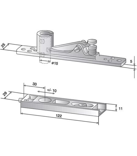 Pivot du haut avec roulement à aiguilles.Pour portes double action en aluminium. acier ou bois. Comprend : - une partie supérieure avec un axe réglable pour compenser la profondeur du profil jusqu'à 20 mm. - une partie inférieure avec roulement à aiguilles. ◉ Détails : Montage : supérieur ◉ Type de porte : aluminium ◉ Compatible avec : BTS ◉ ◉ EAN : 4021226007556 ◉ Marque : DORMAKABA ◉ Référence : 46300003 ◉ Catégorie : Quincaillerie/Ferme-portes, aide à la fermeture des portes et fenêtres/Pivots de porte et accessoires ...