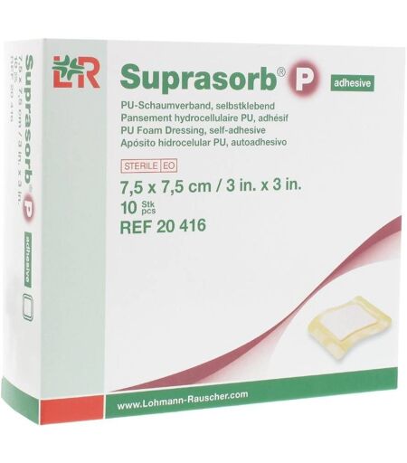 Taille du pansement:7,5 x 7,5 cmIndication:Pansement de mousse PUplaies modérément exsudativesplaies superficiellesplaies non infectéesdans toutes les phases de cicatrisation, par ex. :Escarres et autres ulcèressites donneurs de greffesplaies chirurgicalesDescription du produit:Pansement Hydrocellulaire à trois couches consistant en une couche supérieure en polyuréthane en une mousse en polyuréthane sur le côté de la plaie et une couche de contact avec la plaie perforée en polyuréthane. Le mode de réalisation adhésif a un bord qui garde le pansement en place. Utilisé pour exsudant modéré, les plaies non infectées. Peut rester en place pendant sept jours.très bonne cicatrisation grâce à la gestion fiable de l'exsudatgrand confort de port grâce à une structure souple et douceévaluation aisée de l’exsudat de la plaiemembrane en PU imperméable aux bactéries et aux liquides*)maintient un milieu de cicatrisation humide et favorise donc une cicatrisation naturelle* Suprasorb P non-adhesiveConseils d'utilisation:Suprasorb® P auto-adhésifNettoyer la plaie avec une solution stérile (par ex. solution de Ringer, solution saline physiologique) et tamponner ensuite soigneusement les bords de la plaie avec des compresses stériles pour les sécherRetirer le film protecteur du pansementPoser le pansement au milieu de la plaie. Suprasorb P doit dépasser le bord de la plaie d’environ 2-3 cm.Appuyer Suprasorb P pansement hydrocellulaire au niveau du bord adhésif. Même sur des plaies difficiles à soigner, le pansement auto-adhésif ne nécessite aucune fixation supplémentaire.Précautions d'emploi:Intervalle de changement du pansement: Est déterminé par le médecin traitant selon l’état de la plaie et le degré d’exsudation, au plus tard après 5 à 7 jours. Dès que le bord de la plaie se décolore, le bandage doit être remplacé.Suprasorb P peut être utilisé en tant que pansement secondaire en cas de plaies à risque infectieux dans le cadre d'un traitement antimicrobien classique.À l'état sec, Suprasorb P peut facilement être découpé à la taille de la plaie. Le pansement doit dépasser des bords de la plaie d’environ 2 cm.Conditionnement:pansements x10 ...