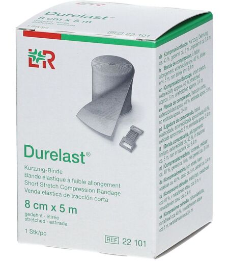 Taille du pansement: 8 cm x 5 m Indication: Bande à extensibilité ultra-courte pour compression forte des membres, notamment en phlébologie et lymphologiepour le soutien et le soulagement en cas d’entorses et de contusions en traumatologie et médecine du sport. Description du produit: La bande à allongement extra court est une bande particulièrement compressive et durablement élastique présentant un allongement très court. Ils servent à la compression forte des extrémités dans le cadre d'un traitement phlébologique, mais aussi pour le traitement d'un lymphœdème aigu et chronique. D'autre part, elle soutient et décharge en cas de distorsions et contusions en traumatologie et en médecine du sport. élastique en longueur (env. 45 %) élasticité durable par des fils de chaîne retors en polyamide texturés tissu maniable avec lisières couleur chair lavable à 95 °C stérilisable à la vapeur d’eau (121 °C), par irradiation et à l’oxyde d’éthylène. Conseils d'utilisation: Lire attentivement le mode d'emploi. Composition: 66 % coton, 34 % polyamide. ...