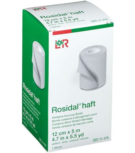 Taille du pansement12 cm x 5 mIndicationsPour la compression des extrémités en particulier en cas de pathologies phlébologiques et lymphologiquesPour le traitement des œdèmesPour soutenir et soulager l'appareil capsulo-ligamentaireAprès des scléroses et des interventions de chirurgie veineuseDescription du produitLa bande à allongement court cohésive éprouvée Rosidal haft est disponible dès maintenant en qualité améliorée pour que son utilisation soit plus simple et que le traitement compressif soit plus efficace.Les bandes à allongement courts sont particulièrement recommandées pour les maladies vasculaires, phlébologiques (troubles veineux par ex. varices) ou lymphologiques (par ex. œdèmes).Avec Rosidal haft, la compression nécessaire sur le plan thérapeutique est maintenue sur une période prolongée. Il est bien toléré par sa rigidité élevée, c'est à dire par sa pression élevée en mouvement et sa pression au repos simultanément faible.Conseils d'utilisationLire attentivement le mode d'emploiComposition99 % coton, 1 % fil synthétique avec un revêtement microponctuel en latex de caoutchouc naturelConditionnement1 pièce ...