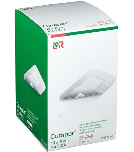 Taille du pansement 8 cm x 10 cm IndicationPour le traitement des plaies post-opératoires, aiguës et superficielles, ainsi que des coupures et des déchiruresPlaies légèrement à modérément exsudativesDescription du produitCurapor est un pansement chirurgical en non-tissé en emballage individuel stérile.RespirantDoux pour la peauFacile à poserRisque d'infection réduit (collé complètement)Angles arrondis pour une tenue prolongéeProtège des souillures et des effets mécaniquesConseils d'utilisationSe conformer aux informations disponibles sur l'emballage.Appliquer sur peau propre et sèche.CompositionSupport non tissé : blanc, 100 % polyester , adhésif polyacrylate doux pour la peau (sans colophane ni dérivé de colophane).Compresse : Couche absorbante en viscose/polyester, couche de contact avec la plaie en polyester/ polyéthylène.ConditionnementPansements x50 ...