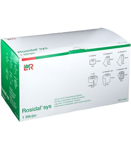 Taille du pansement: 7 (20 cm) 10 cm x 2 m x 0,2 cm 8 cm x 5 m 10 cm x 5 m 2,5 cm x 5 m 8 cm x 20 m Indications: Pour le traitement de l’ulcère variqueux (Ulcus cruris venosum) tg® Bandage tubulaire Protection pour la peau sous le bandage de compression décongestionnant Rosidal® soft Bande Rembourrage sous le bandage de compression pour une répartition homogène de la pression ainsi que pour prévenir les constrictions et les points de pression et empêcher le bandage de glisser Rosidal® K Bande Bande à extensibilité courte à compression forte Porofix® Fixation des extrêmités de bandages Mollelast® haft Bande Fixation du rembourrage Description du produit: La troussée Rosidal sys contient les éléments suivants : tg Bandage tubulaire Rosidal soft Bande Rosidal K Bande Porofix Mollelast haft Bande information patient Compresser avec le système L'assemblage compliqué de composants individuels freine l'efficacité. C'est pourquoi nous recommandons le système de compression Rosidal sys avec ses composants parfaitement adaptés les uns aux autres, dans une qualité élevée et durable. Le système pratique, disponible en trousse, contient tous les éléments médicaux nécessaires pour un bon traitement compressif. Le système de compression à allongement court permet le traitement efficace des ulcères variqueux. La faible élasticité du bandage compressif (rigidité) engendre une décongestion rapide de l'extrémité concernée. Rosidal sys reste en place jour et nuit sur la jambe en phase aiguë, jusqu'à sept jours. Le produit se distingue par ses composants particulièrement doux pour la peau. Le pansement, de notre gamme Suprasorb par exemple, peut être ajouté de manière adaptée aux différentes phases de la plaie de sorte que celle-ci soit soignée de manière optimale. Le changement de pansement est réalisé de manière individuelle pour chaque patient La sécurité thérapeutique sous forme de trousse La trousse Rosidal sys est prête à l'emploi et particulièrement efficace et économique dans le traitement de longue durée. En effet, étant donné que le rembourrage et les bandes de compression peuvent être réutilisées, la réduction de coût par rapport aux produits à usage unique est importante. Le bandage de rembourrage Rosidal soft ainsi que la bande à allongement court Rosidal K peuvent être lavés jusqu'à 50 fois. En outre, cette solution permet de gagner du temps lors de son utilisation et offre également une sécurité thérapeutique élevée. Par conséquent, la gestion complexe de chaque produit est également inutile. efficace et économique grâce à la réutilisabilité des bandes de compression et des bandes pour rembourrage (Rosidal soft et Rosidal K) prêt à l’emploi et combiné dans une trousse pratique Conseils d'utilisation: Lire attentivement le mode d'emploi. Rosidal soft et Rosidal K lavables jusqu’à 50 fois à 95 °C le système peut être porté en continu jusqu’à 7 jours (la grande pression de compression est préservée, ce qui a été prouvé scientifiquement par le Professeur... ...