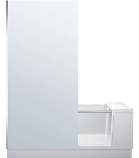 Douche + Bain Duravit pour un grand confort dans les petites salles de bains Douche à l'italienne et baignoire en un, Shower + Bath allie un design de salle de bains moderne et une utilisation optimale de l'espace. De plus, la conception du groupe de design EOOS offre des sièges confortables et un espace de rangement supplémentaire. Les options d'installation peu encombrantes ouvrent également davantage de possibilités créatives pour la planification des rénovations de salles de bains. Caractéristiques du produit Version encastrable avec panneau pour installation en angle à gauche Baignoire, revêtement de baignoire et base en DuraSolid® (moulage minéral) antidérapant et teinté avec une surface mate chaude et soyeuse Intérieur spacieux avec des parois presque verticales pour plus d'espace et une plus grande liberté de mouvement lors de la douche Porte en verre de sécurité trempé de 10 mm et main courante en laiton chromé La porte pliante permet d'utiliser la baignoire comme douche à l'italienne Le verrouillage de sécurité mécanique empêche l'ouverture de la porte vitrée lorsque le drain est fermé - aucune connexion électrique requise Avec cloison de douche en verre de sécurité trempé de 8 mm d'épaisseur avec profilé en verre aluminium Version en verre transparent de la cloison de douche sous le bord de la baignoire pour un look uniforme blanc imprimé Avec coussin de siège multifonctionnel imperméable blanc, utilisable comme siège, couvre-porte, dossier positionnable individuellement et espace de rangement dans toute la zone de douche et de bain Cadre de base monté et tuyau de vidange flexible veuillez commander garniture de vidange 0 791246000001000 ou 791249000001000 séparément - non incluses dans la livraison Disponible également en version miroir en option : Dans cette variante, la cloison de douche est transparente à l'intérieur et entièrement réfléchissante à l'extérieur. Le miroir pleine longueur pratique apporte un espace optique supplémentaire aux petites salles de bains. ...