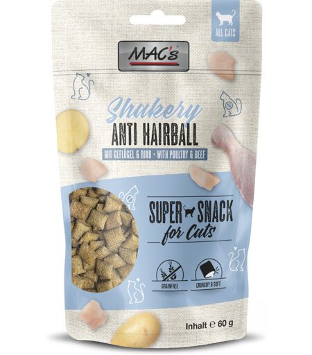 3 x 60 g MAC’s Cat Shakery Snacks Anti-Hairball au poulet et au bœuf