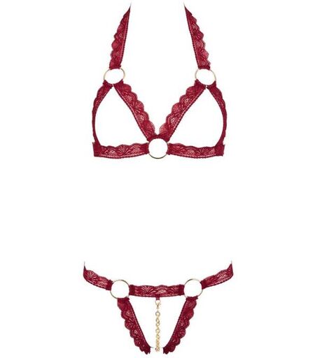 Avec cet incroyable Ensemble 2 Pièces Ouvert Bordeaux de la marque Cottelli Collection vous pourrez abandonner entièrement votre corps à votre partenaire.   Ce magnifique ensemble en dentelle bordeaux très sexy va sublimer vos formes, votre intimité et votre beauté. Il est composé d'un soutien-gorge ouvert avec des lanières qui viendront entourer la poitrine pour la sublimer. Les anneaux placés sur le haut de vos seins ainsi qu'entre ajoute une touche très sexy à votre ensemble. Le string assorti ouvert orné d'une sublime chaîne couleur or habillera votre nudité sensuellement. Dans cet ensemble l'excitation de votre partenaire sera attisée ! Tailles S/M, M/L. ...
