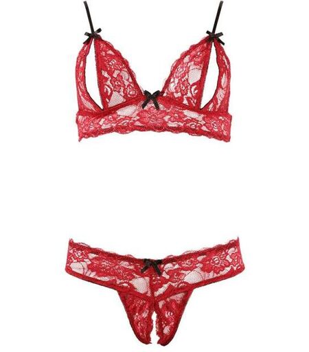 Je suis votre Ensemble Dentelle 2 Pièces Ouvert de la marque Cottelli Collection. Je suis ouvert, sexy et je séduis votre partenaire sans scrupules ! Mon soutien-gorge en délicate dentelle florale rouge est ouvert au centre des bonnets triangle pour laisser apparaître les tétons et jouer espièglement avec le désir de votre moitié. Je suis agrémenté de délicieux petits noeuds noirs à la base des bretelles et au creux de vos seins afin d'ajouter une note de coquetterie charmante à l'ensemble. Mon string est aussi sexy que mon haut avec l'ouverture à l'entrejambe qui accordera le coup fatal à la patience de votre partenaire. J'apporte une touche de glamour et d'érotisme en plus avec d'autres petits noeuds noirs à l'avant et à l'arrière. Composition : 90% Polyamide, 10% Élasthanne ...