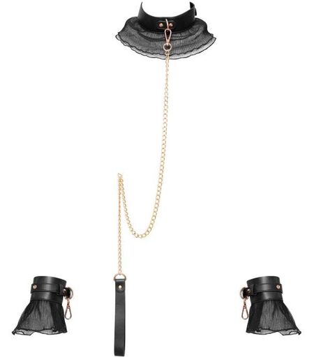Je suis le Kit Bondage Collier et Menottes à Volants de la marque Bad Kitty (https://www.espaceplaisir.fr/marques/220-bad-kitty). Mon collier, ma laisse et mes menottes à volants vous donnent un look sexy lors de jeux de soumission et de domination... Portez mon collier avec laisse autour du cou, et mes menottes aux poignets. Mes volants affriolants apportent une touche glamour à votre look BDSM ! En complicité avec votre partenaire, explorez vos fantasmes les plus osés avec les jeux de contrainte érotique que je vous permets d'expérimenter. Mon collier et mes menottes sont réglables pour s'ajuster à la morphologie de chacun·e. Quant à ma laisse, elle se détache de mon collier pour vous permettre de varier les jeux en utilisant mes accessoires indépendemment ! Composition : polyuréthane, métal, polyester. Sous-vêtements non inclus. ...