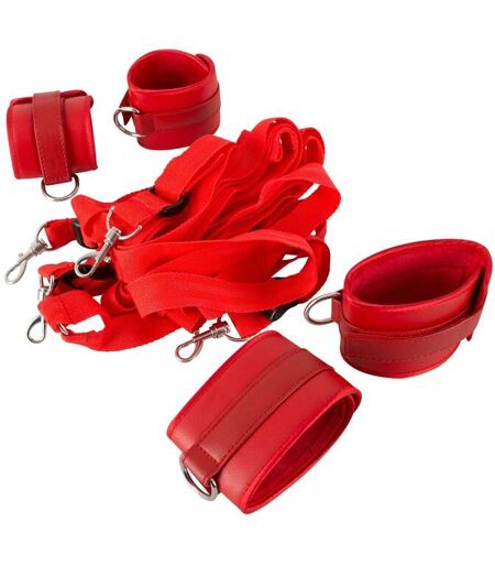 Découvrez les plaisirs du bondage avec le Kit d'Attaches de Lit Rouge de Bad Kitty. Ce kit comprend des sangles en X à placer sous le matelas pour faire de votre lit votre terrain de jeux coquins préféré ! Les sangles sont ajustables pour s’adapter à la plupart des tailles. Vous trouverez aussi dans le kit une paire de menottes pour les poignets et une paire de menottes pour les chevilles. Les menottes se ferment avec des scratchs et sont équipées d’anneaux en D afin d’y accrocher les mousquetons au bout des 4 sangles qui forment le X. Fabriquées en similicuir souple et résistant, elles seront suffisamment confortables pour vous permettre de réaliser vos fantasmes en couple ! Expérimentez de nouvelles positions ou des séances BDSM intenses à deux pour des plaisirs divers et variés ! Composition : 100% polyuréthane. ...