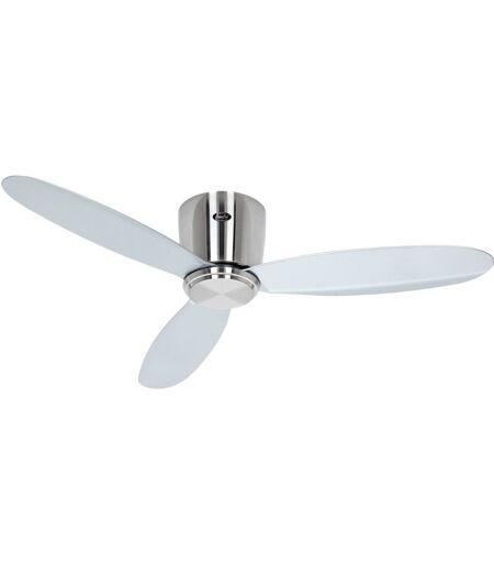 Dimensions et données techniques 100-240 V ~ 50/60 Hz Diamètre : 112 cm Couleur du boîtier : chrome brossé Couleur des pales : argent Puissance moteur : 1 / 1,8 / 3,4 / 5,7 / 8,8 / 13 W Tours par minute : 30 / 65 / 102 / 135 / 171 / 208 Débit d'air max. : 71 m³/min Efficacité: 5,5 (m³/min)/W Niveau de pression acoustique max. Lp-3m: 24,2 dB(A) Niveau de puissance acoustique max. : 44,7 dB(A) Pales au plafond : 16 cm Hauteur totale : 20 cm Diamètre du boîtier : 19 cm Ne convient pas aux plafonds en pente Fonction été / hiver (rotation en avant et en arrière) Télécommande incluse : 6 vitesses / off, mode été / hiver, minuterie Poids : 5,9 kg ...