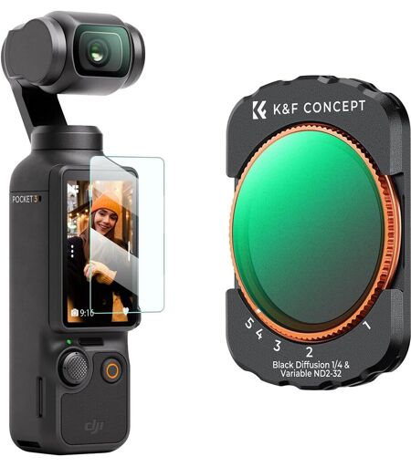 [Compatible with DJI OSMO Pocket 3 Drone]: The filter is a 2 in 1 that combines the function of 1/4 black-mist filter and ND variable nd2-32 filter. The 1/4 black diffusion filter not only reduces reflections and glare, but also smooths the skin, reduces wrinkles and yellow spots on the face. The neutral density filter reduces the amount of light (1-5 f-stops) that reaches the film without altering the colour.[High Quality]: The special effect filter is made of high-end AGC optical glass, with a 28-layer nano-coating that balances colors, reduces unwanted reflections and protects the lens from water, scratches and oils.[ Very Light]: Black pro-mist&nd; variable filter frames/frames are made of aluminium. Lightweight, the filter weight does not disturb the carrycot. It does not cause the drone to be overweight.[ Easy to use]: There is a quick system so the filter is easy to put on and take off. Once in place they do not generate any vibration and they hold very well.[No Glare]: Both sides of the filter glass are used polishing technology to balance the light penetration path and ensure image quality. The filter surface is treated black to minimize reflection and reduce impact on the image.K&F; CONCEPT is the world's No.1 brand in terms of lens filter online sales volume among camera-accessory-focused brands. (K&F; CONCEPT is the #1 brand of photography accessories in terms of sales of lens filters across the entire online network in the world) Source: Euromonitor, 2024 data. ...
