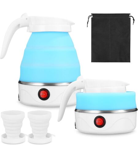 FOLDABLE CHAIN - Our 0.6L mini kettle is foldable and measures about 20cm in height and easily folds to 10cm. Small and lightweight, the foldable kettle fits easily into suitcases and backpacks and saves up to 30% space in your travel bag.FAST COLD Our foldable travel kettle uses the latest 600W heating technology to boil water in 4-6 minutes. Whether camping or travelling, you always have a quick cup of tea, coffee, oatmeal or milk at hand. The kettle will automatically turn off when the water boils so that it does not burn. When the water temperature drops below 50¿, the kettle will start boiling again and can withstand up to 230¿.Safety Barrier The mini kettle features dry fire protection that automatically turns off the camping kettle when the water is off. The kettle has a portable lid that opens by turning the lid over to prevent burns. The spout of the kettle is rounded, which can play the role of filtration. The power cord is removable, more convenient to store and carry.Premium Material Our silicone foldable camping kettle is made of 100% food grade silicone and high quality 304 stainless steel, BPA free, non-toxic, uncoated, does not rust, high temperature resistant, not easy to yellow or crack, no fresh water flow. The handle and lid are made of strong PP material, not easy to damage, safe and reliable, with continuous and stable performance, suitable for long-term use.EASY TO USE - The 600ml small travel kettle has a simple one-button operation and the capacity is marked on the kettle to avoid overfilling or underfilling. Just press the switch to boil the water. Once the water boils, you can unplug the power cord from the kettle for easy storage and pouring. Perfect for travel, camping, outdoor picnics, hotel stays, office and other occasions, also suitable as a Christmas, birthday or party gift for family and friends ...