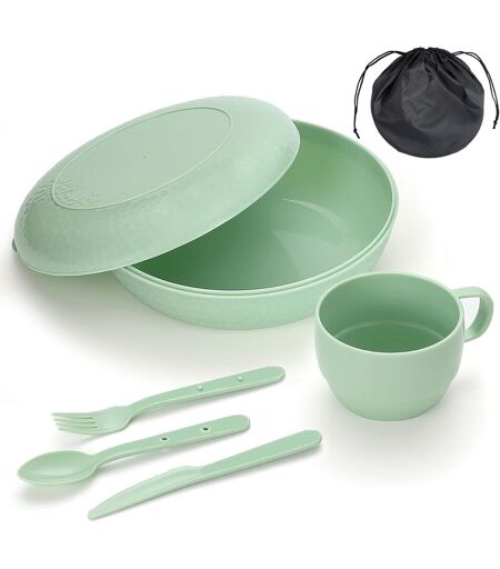 All-In-One Compact Outdoor Solution: The HOMQUEN camping mess kit includes a drinking cup, plate, bowl, fork, spoon, knife and carry bag, everything you need for on-the-go meals. The bowl and plate nest well together, while the cup and utensils fit neatly inside, minimizing space in your backpack.Innovative interlocking design: Designed for convenience, the fork, spoon and knife attach firmly, preventing them from tickling or getting lost. This smart design ensures easy access and organized storage while camping, hiking or picnic.LIGHTWEIGHT & DURABLE CONSTRUCTION: Made from high-quality, BPA-free plastic, this mess kit is incredibly lightweight yet built to withstand the rigors of outdoor use. It is resistant to cracks and breaks, making it a reliable companion for all your adventures.Comfortable to use and easy to clean: With ergonomic handles that provide a comfortable grip, these utensils make eating outdoors a breeze. Plus, smooth surfaces are dishwasher safe, allowing for quick and hassle-free cleaning after every meal.VERSATILE FOR ALL OUTDOOR ACTIVITIES: Whether you're camping in the desert, traveling on a road trip, hiking in the mountains, picnicking in the park or sweeping with friends, this mess kit is the perfect choice. Its compact size and light weight make it easy to carry wherever your trip takes you. ...