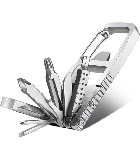 STAINLESS STEEL MATERIAL: The multifunctional knife is made of stainless steel material, high hardness, sturdy, rust-resistant, no metal smell, which can be used for a long time.FUNCTIONS INCLUDED: This multi-function key holder is equipped with 12 functions, including large Phillips screwdriver bit, large slotted screwdriver bit, hex screwdriver bit, small Phillips screwdriver bit, can opener, bottle opener, small slot screwdriver bit, card removal pin, carabiner, star screwdriver bit, cell phone holder, ruler.EASY TO HANG: The pocket screwdriver can be easily hung on key chains, belt loops, backpacks and more, stable structure, excellent performance, very convenient to use.COMPACT AND LIGHTWEIGHT: Our multi-function screwdriver comes with compact size, lightweight, suitable for daily tools, very convenient. You can use it according to the actual situation.WIDELY USED Whether you need a screwdriver, bottle opener or ruler, our mini multi-function tweezers can help. Perfect for outdoor activities, DIY projects and emergency situations. ...