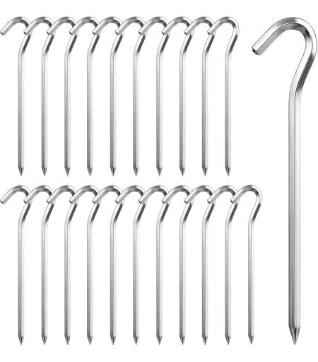 [Upgraded Material]Made of high quality aluminum alloy, they are strong and not easy to deform. Lighter than traditional tent pegs, each stake weighs only 16g, making them easier to carry and makes it a great choice for outdoor camping.MULTI-PURPOSE - The pack of 22 silver tent pegs is ideal for anchoring camping tents, tents, awnings, fences, gardens, sheds, tarpaulins, garden nets, gazebo anchors, Halloween fences and Christmas decorations.OUTDOOR CAMPING PEGS - The 6mm diameter tent pegs are perfect for outdoor use. They are designed to anchor firmly, providing stability and security. With these pegs your tent will retain its shape and stay in place even in windy weather, allowing you to relax and enjoy your camping experience.GREAT DESIGN - Sturdy design with large non-slip hook and pointed end to hold firmly in a wide range of floor conditions. The hook prevents the stake from sinking too deep and going unnoticed. These tent pegs are ideal for outdoor camping.Easy to use: push the stake into the ground, hold an angle of about 60° with the ground and push it deeper into the ground to fix it better, then tie the tent rope or anchor the tent net. ...